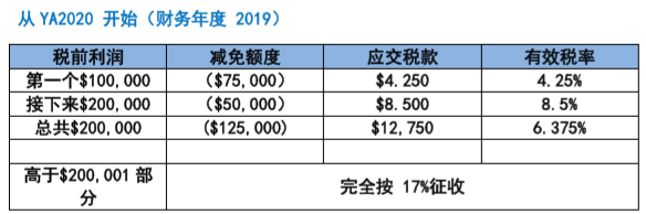 目前,新加坡自2020年开始及2019年后成立且符合相关规定的企业,首个三年应税所得中,拥有税收减免计划,首10万新币应税利润可享有75%的税收减免,税率是4.25% ;高于20万新币的部分按标准的17%的税率计算。第二个10万新币应税利润可享有50%的税收减免,税率为8.5%。
