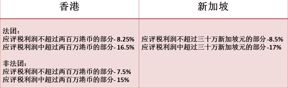 由上述可看出,对于新成立的利润额较小(几十万)的小微型企业,新加坡的税率更具有竞争优势,而对于盈利较大的中大型企业,两个地区在税收上相差并不大。