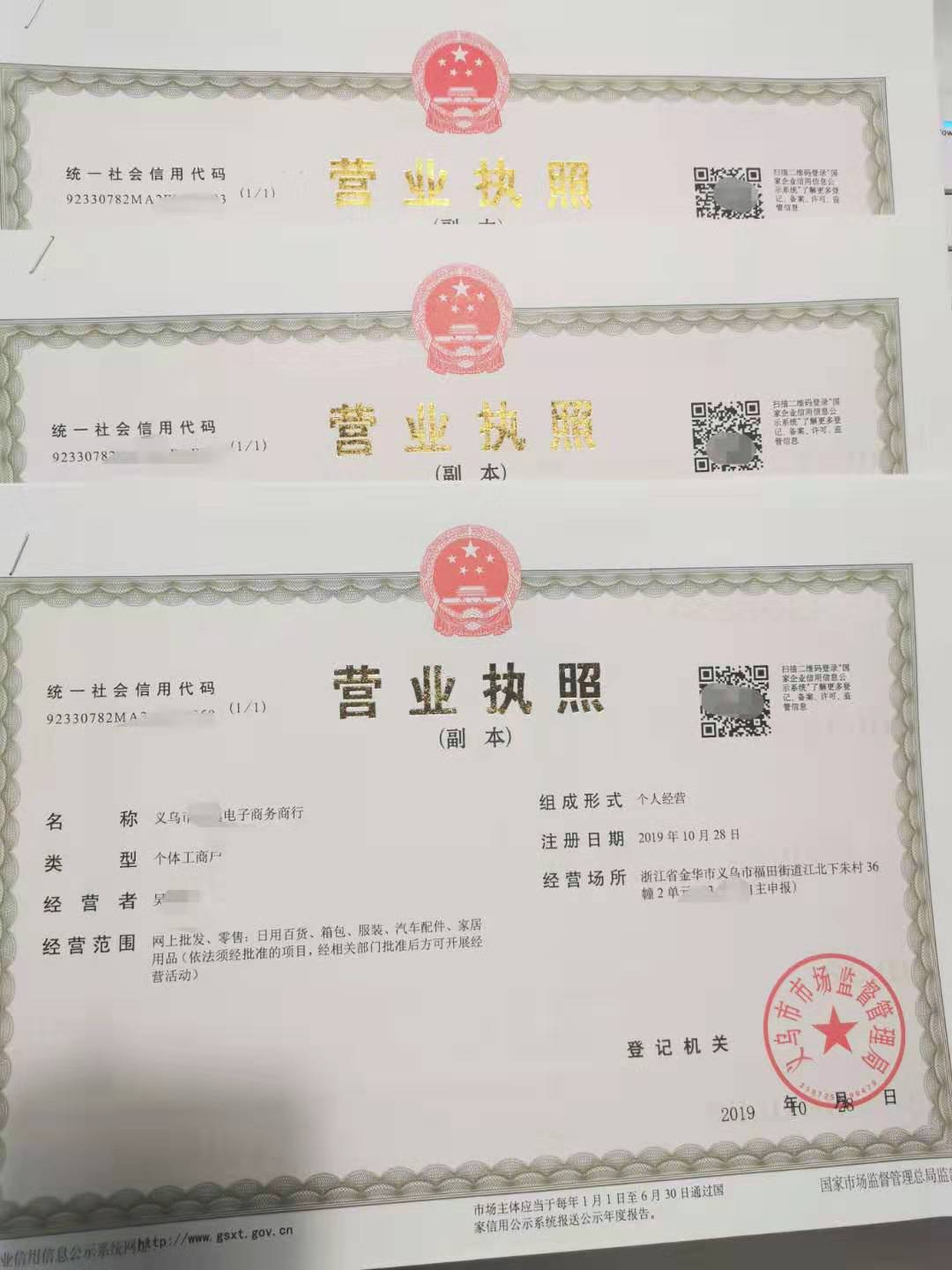 2个体户名称:格式(义乌市**电子商务商行)一般是工商随机的