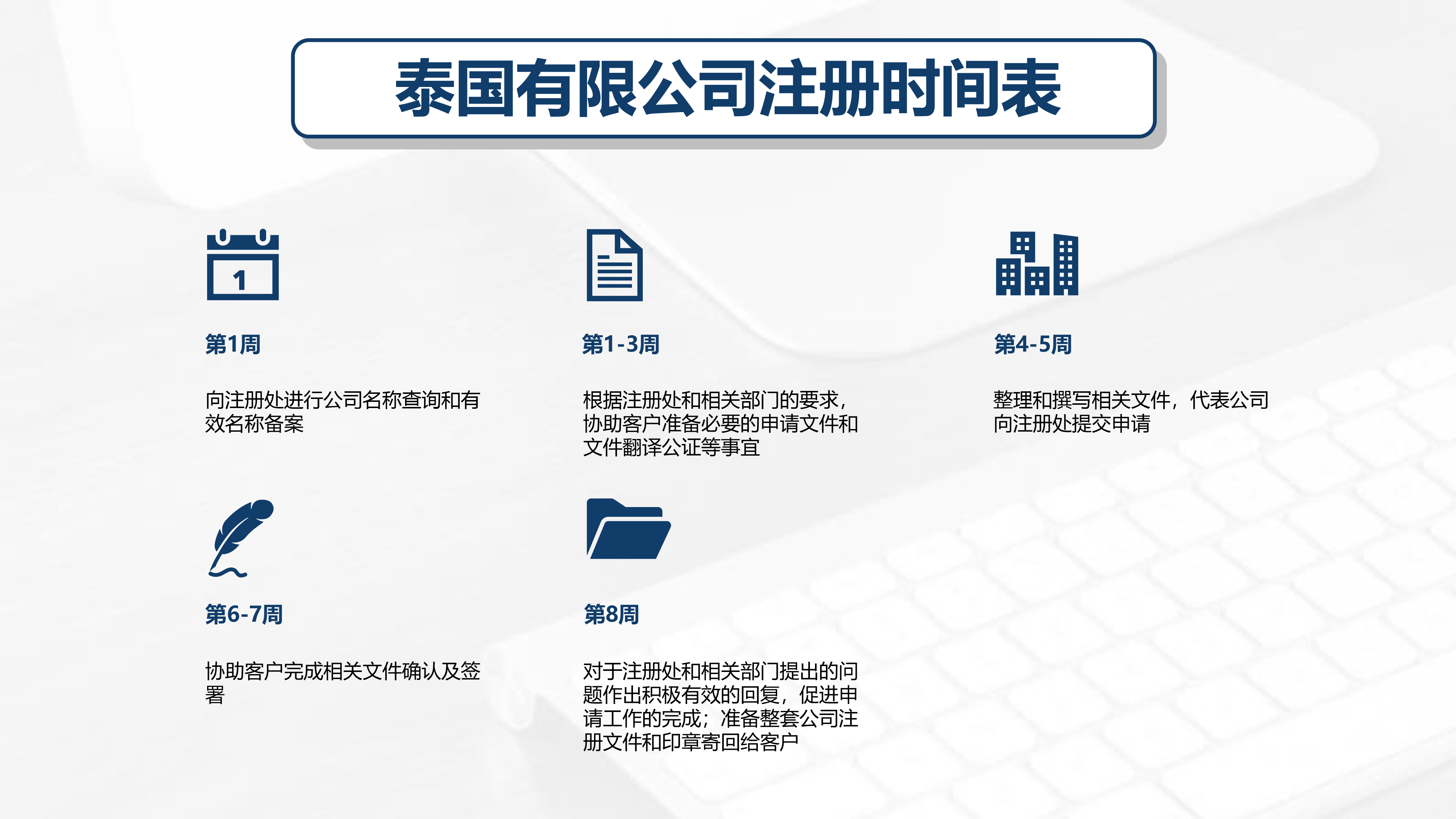 1、确定注册公司名称:提供英文公司名,如公司名出现“泰国”两字需放入括号内,即XXX (Thailand) Co.,Ltd.