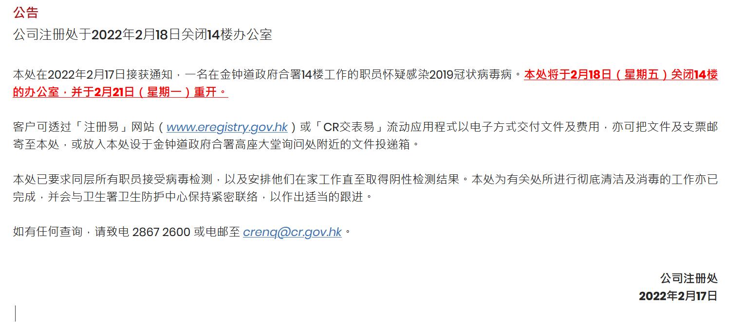 受疫情影响,香港公司注册处今日起关闭14楼办公室,18日重开。